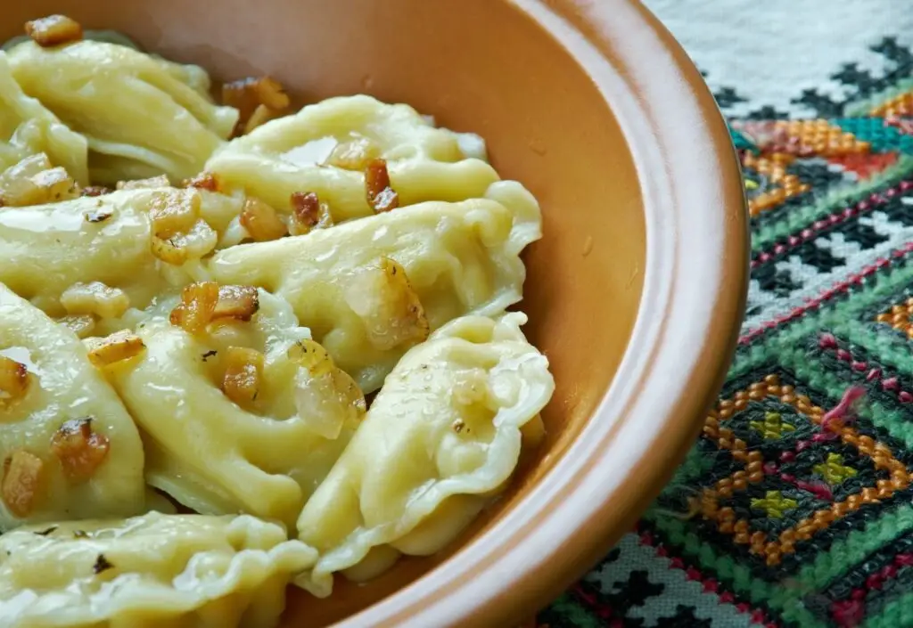 Prebaciti pirogije na cedilo ili kratko u posudu s hladnom vodom, a zatim na suvu krpu da se ukloni višak vlage. Poslužiti preljevane rastopljenim maslacem i ukrašene zlatno prženim lukom.